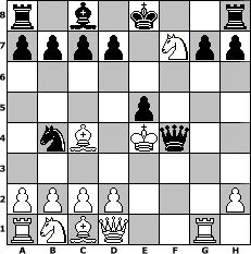 Partie-Notation im PGN-Format [Event "MI6 Contest"] [Site "www.mySchach.de"] [Date "2009.04.14"] [Round "1"] [White "Nightflight"] [Black "muetoe"] [ECO "C57"] [WhitemyELO "1604"] [BlackmyELO "1946"] [Result "0-1"] [TimeControl "10/3456000"] [WhiteDays "79"] [BlackDays "70"] [MySchachNr "54804"] 1. e4 e5 2. Nf3 Nc6 3. Bc4 Nf6 4. Ng5 Bc5 5. Nxf7 Bxf2+ 6. Kxf2 Nxe4+ 7. Ke1 Qh4+ 8. g3 Nxg3 9. Rg1 Ne4+ 10. Ke2 Qf2+ 11. Kd3 Nb4+ 12. Kxe4 Qf4# 0-1 Stellungs-Notation im FEN-Format r1b1k2r/pppp1Npp/8/4p3/1nB1Kq2/8/PPPP3P/RNBQ2R1 - kq - 1 13 Geschlagene Figuren Weiss: Geschlagene Figuren Schwarz: Klicken Sie auf eine geschlagene Figur um den gewünschten Zug darzustellen!