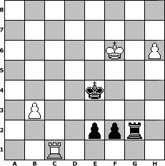 37. Kg5 Rg2+ 38. Kf6 e2 39. Rc1 f4 40. h5 f3 41. h6 f2 0-1