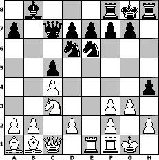 Partie-Notation im PGN-Format [Event "1.MySchach-960-Cup 2015"] [Site "www.mySchach.de"] [Date "2015.10.07"] [Round "1"] [White "nyffhans"] [Black "espero"] [Variant "Fischerrandom"] [SetUp "1"] [FEN "bbqnnrkr/pppppppp/8/8/8/8/PPPPPPPP/BBQNNRKR w KQkq - 0 1"] [WhitemyELO "1996"] [BlackmyELO "2053"] [Result "0-1"] [TimeControl "10/1728000"] [WhiteDays "00"] [BlackDays "08"] [MySchachNr "100692"] 1. b4 b6 2. c4 c5 3. bxc5 bxc5 4. Nf3 Bxf3 5. exf3 Ne6 6. Re1 Nd6 7. O-O Qc7 8. g3 h5 9. Nc3 h4 0-1 Stellungs-Notation im FEN-Format 1b3rkr/p1qpppp1/3nn3/2p5/2P4p/2N2PP1/PP1P1P1P/BBQ1RRK1 - kq - 0 10 Geschlagene Figuren Weiss: Geschlagene Figuren Schwarz: Klicken Sie auf eine geschlagene Figur um den gewünschten Zug darzustellen!