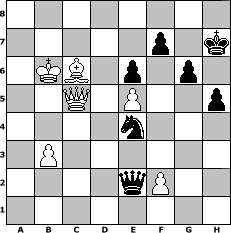 Partie-Notation im PGN-Format [Event "Spanisch?"] [Site "www.mySchach.de"] [Date "2016.09.07"] [Round "2"] [White "freizeitspieler"] [Black "Joschi"] [ECO "E00"] [WhitemyELO "1618"] [BlackmyELO "1563"] [Result "0-1"] [TimeControl "10/2592000"] [WhiteDays "131"] [BlackDays "210"] [MySchachNr "104835"] 1. d4 Nf6 2. c4 e6 3. g3 d5 4. Nc3 Bb4 5. Bg5 O-O 6. Bg2 c6 7. e3 Nbd7 8. Nge2 Qc7 9. Qc2 dxc4 10. Bf4 Bd6 11. O-O Bxf4 12. Nxf4 a6 13. a4 a5 14. Ne4 Nxe4 15. Bxe4 Nf6 16. Bg2 Rb8 17. Qxc4 Bd7 18. Rac1 Rfc8 19. b3 Qd6 20. Qc3 Ra8 21. e4 Ne8 22. e5 Qe7 23. Nd3 b6 24. Nb2 Ra7 25. Nc4 Rb8 26. Ne3 Rc8 27. Qd3 c5 28. Nc4 b5 29. Nb6 Rb8 30. Nxd7 Qxd7 31. Rxc5 bxa4 32. Bc6 Qe7 33. Bxa4 Nc7 34. Rfc1 g6 35. R1c4 Nd5 36. Qd2 Nb4 37. Qh6 Qf8 38. Qg5 h6 39. Qf6 Qg7 40. Rc8+ Rxc8 41. Rxc8+ Kh7 42. Qd8 h5 43. g4 Nd5 44. Rc5 Nf4 45. g5 Qg8 46. Qb6 Ra8 47. Rxa5 Rxa5 48. Qxa5 Ne2+ 49. Kg2 Nxd4 50. Qc5 Qa8+ 51. Kg1 Nf3+ 52. Kf1 Nxh2+ 53. Ke1 Qh1+ 54. Ke2 Qf1+ 55. Kd2 Nf3+ 56. Ke3 Nxg5 57. Bc6 Qe1+ 58. Kd3 Qd1+ 59. Kc4 Qc2+ 60. Kb4 Qd2+ 61. Kb5 Qe2+ 62. Kb6 Ne4 0-1 Stellungs-Notation im FEN-Format 8/5p1k/1KB1p1p1/2Q1P2p/4n3/1P6/4qP2/8 - - - 12 63 Geschlagene Figuren Weiss: Geschlagene Figuren Schwarz: Klicken Sie auf eine geschlagene Figur um den gewünschten Zug darzustellen!