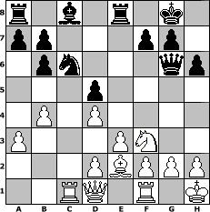 Partie-Notation im PGN-Format [Event "Winterende2014"] [Site "www.mySchach.de"] [Date "2014.03.06"] [Round "2"] [White "lasker"] [Black "Schachboy1"] [ECO "D06"] [WhitemyELO "1155"] [BlackmyELO "1439"] [Result "1-0"] [TimeControl "10/1728000"] [WhiteDays "16"] [BlackDays "00"] [MySchachNr "93416"] 1. d4 d5 2. c4 Nf6 3. Nc3 e6 4. Nf3 Bb4 5. Bg5 O-O 6. e3 Nc6 7. cxd5 exd5 8. Be2 h6 9. Bxf6 Qxf6 10. O-O Rd8 11. a3 Ba5 12. b4 Bb6 13. Na4 Re8 14. Nxb6 cxb6 15. Rc1 Qg6 16. Kh1 1-0 Stellungs-Notation im FEN-Format r1b1r1k1/pp3pp1/1pn3qp/3p4/1P1P4/P3PN2/3PBPPP/2RQ1R1K - - - 3 16 Geschlagene Figuren Weiss: Geschlagene Figuren Schwarz: Klicken Sie auf eine geschlagene Figur um den gewünschten Zug darzustellen!