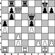 Partie-Notation im PGN-Format [Event "Herbst 2016"] [Site "www.mySchach.de"] [Date "2016.09.13"] [Round "1"] [White "nomasa"] [Black "Knight"] [ECO "A15"] [WhitemyELO "1511"] [BlackmyELO "1133"] [Result "0-1"] [TimeControl "10/1728000"] [WhiteDays "00"] [BlackDays "60"] [MySchachNr "104911"] 1. c4 Nf6 2. d4 d5 3. cxd5 Nxd5 4. Nf3 Nc6 5. e4 Nb6 6. d5 Nb8 7. a4 a5 8. Be3 e6 9. Nc3 Bb4 10. Bb5+ Bd7 11. dxe6 fxe6 12. Ne5 Bxc3+ 13. bxc3 O-O 14. Bxb6 cxb6 15. Nxd7 Nxd7 16. Qxd7 Qf6 17. O-O Rfd8 18. Qc7 e5 19. Bd7 Qe7 20. Rfd1 Rab8 21. Be6+ Qxe6 0-1 Stellungs-Notation im FEN-Format 1r1r2k1/1pQ3pp/1p2q3/p3p3/P3P3/2P5/2P2PPP/R2R2K1 - - - 0 22 Geschlagene Figuren Weiss: ![]() ![]() ![]() ![]() ![]() ![]() ![]() ![]() ![]() ![]() ![]() ![]() ![]() ![]() ![]() Geschlagene Figuren Schwarz: ![]() ![]() ![]() ![]() ![]() ![]() ![]() ![]() ![]() ![]() ![]() ![]() ![]() ![]() ![]() Klicken Sie auf eine geschlagene Figur um den gewünschten Zug darzustellen!
