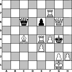 Partie-Notation im PGN-Format [Event "Tigran (Wartanowitsch)Petrosjan Turnier"] [Site "www.mySchach.de"] [Date "2009.08.09"] [Round "1"] [White "neve"] [Black "Ostseeboy"] [ECO "D20"] [WhitemyELO "1504"] [BlackmyELO "1262"] [Result "1-0"] [TimeControl "10/2592000"] [WhiteDays "150"] [BlackDays "150"] [MySchachNr "58157"] 1. d4 d5 2. c4 dxc4 3. Nc3 Nf6 4. e3 e6 5. Bxc4 Bb4 6. Nf3 O-O 7. O-O Nc6 8. Qc2 Na5 9. Bd3 g6 10. a3 Be7 11. Bd2 a6 12. b4 Nc6 13. Ne4 Nxe4 14. Bxe4 Bd7 15. a4 Nxb4 16. Bxb4 Bxb4 17. Bxb7 Rb8 18. Bxa6 Rb6 19. Bd3 Rc6 20. Qe2 Bc3 21. Ra2 Qf6 22. Ne5 Bc8 23. Nxc6 Bb7 24. Ne5 Qg5 25. f4 Qf6 26. Nd7 Qg7 27. Nxf8 Qxf8 28. a5 Bd5 29. Bc4 Be4 30. a6 Bb4 31. Qb2 c5 32. Rd1 cxd4 33. Rxd4 Bc5 34. Rxe4 Qd6 35. Qc1 Kg7 36. a7 Bxa7 37. Rxa7 Qb6 38. Qa1+ Kh6 39. Rxf7 Qc6 40. Qg7+ Kh5 41. Qxh7+ Kg4 42. Qxg6+ 1-0 Stellungs-Notation im FEN-Format 8/5R2/2q1p1Q1/8/2B1RPk1/4P3/6PP/6K1 - - - 0 42 Geschlagene Figuren Weiss: Geschlagene Figuren Schwarz: Klicken Sie auf eine geschlagene Figur um den gewünschten Zug darzustellen!