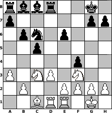Partie-Notation im PGN-Format [Event "Schach"] [Site "www.mySchach.de"] [Date "2007.12.05"] [Round "1"] [White "ujack1961"] [Black "johnnschy"] [ECO "B30"] [WhitemyELO "1768"] [BlackmyELO "1606"] [Result "1/2-1/2"] [TimeControl "10/864000"] [WhiteDays "09"] [BlackDays "05"] [MySchachNr "40386"] 1. e4 c5 2. Nf3 Nc6 3. Nc3 Nf6 4. Bc4 e6 5. O-O Nxe4 6. Nxe4 d5 7. d3 dxc4 8. a3 cxd3 9. Qxd3 Qxd3 10. cxd3 f5 11. Nc3 Bd6 12. Nb5 Bb8 13. Re1 O-O 14. Be3 b6 15. Nc3 Rd8 16. Rad1 f4 17. Bc1 1/2-1/2 Stellungs-Notation im FEN-Format rbbr2k1/p5pp/1pn1p3/2p5/5p2/P1NP1N2/1P2PPPP/2BRR1K1 - - - 1 17 Geschlagene Figuren Weiss: ![]() ![]() ![]() ![]() ![]() ![]() ![]() ![]() ![]() ![]() ![]() ![]() ![]() ![]() ![]() Geschlagene Figuren Schwarz: ![]() ![]() ![]() ![]() ![]() ![]() ![]() ![]() ![]() ![]() ![]() ![]() ![]() ![]() ![]() Klicken Sie auf eine geschlagene Figur um den gewünschten Zug darzustellen!