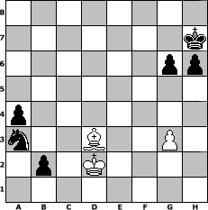 | Partie-Notation im PGN-Format [Event "Winterturnier"] [Site "www.mySchach.de"] [Date "2009.11.12"] [Round "1"] [White "beowulf"] [Black "muellerh"] [ECO "A40"] [WhitemyELO "1355"] [BlackmyELO "1480"] [Result "0-1"] [TimeControl "10/3456000"] [WhiteDays "199"] [BlackDays "148"] [MySchachNr "60564"] 1. d4 e6 2. c4 d5 3. a3 Nf6 4. Nc3 a6 5. Bg5 Be7 6. e3 O-O 7. Nf3 h6 8. Bxf6 Bxf6 9. Bd3 dxc4 10. Bxc4 b5 11. Bb3 Bb7 12. O-O Qe7 13. Rc1 Rd8 14. e4 c5 15. e5 Bg5 16. Nxg5 Qxg5 17. f3 cxd4 18. Ne4 Qxe5 19. Rc5 Qf4 20. g3 Qe3+ 21. Rf2 d3 22. Rc3 Bxe4 23. fxe4 Qxe4 24. Rd2 Qe3+ 25. Kf1 Qe4 26. Rcxd3 Qh1+ 27. Kf2 Qxh2+ 28. Kf3 Rxd3+ 29. Rxd3 Qh5+ 30. Kg2 Qxd1 31. Rxd1 Nc6 32. Rd6 Na5 33. Bd1 Nc4 34. Bf3 Ra7 35. Rd8+ Kh7 36. Be4+ f5 37. Ra8 Rxa8 38. Bxa8 Nxb2 39. Bb7 a5 40. Bc8 Nc4 41. Bxe6 Nxa3 42. Bxf5+ g6 43. Bd3 a4 44. Kf2 b4 45. Ke2 b3 46. Kd2 b2 0-1 Stellungs-Notation im FEN-Format 8/7k/6pp/8/p7/n2B2P1/1p1K4/8 - - - 0 47 Geschlagene Figuren Weiss:                              Geschlagene Figuren Schwarz:                               Klicken Sie auf eine geschlagene Figur um den gewünschten Zug darzustellen!