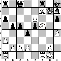 Partie-Notation im PGN-Format [Event "Schach dem "Nikolaus II""] [Site "www.mySchach.de"] [Date "2010.11.13"] [Round "1"] [White "Jonas84"] [Black "reisinger"] [ECO "D01"] [WhitemyELO "1379"] [BlackmyELO "1422"] [Result "1-0"] [TimeControl "10/2592000"] [WhiteDays "88"] [BlackDays "90"] [MySchachNr "69814"] 1. d4 d5 2. Nc3 Bf5 3. Nf3 e6 4. a3 Be7 5. Bf4 a6 6. e3 Nc6 7. Be2 Nf6 8. O-O O-O 9. Ne5 Nxe5 10. Bxe5 c5 11. f4 h6 12. Bf3 b5 13. Ne2 Nd7 14. Ng3 Bh7 15. f5 f6 16. fxe6 Nxe5 17. dxe5 fxe5 18. Bh5 Qd6 19. Bf7+ Kh8 20. Nf5 Qd8 21. Qg4 Bg5 22. h4 Bxe3+ 23. Nxe3 d4 24. Nf5 Qc8 25. Qxg7# 1-0 Stellungs-Notation im FEN-Format r1q2r1k/5BQb/p3P2p/1pp1pN2/3p3P/P7/1PPP2P1/R4RK1 - - - 0 25 Geschlagene Figuren Weiss: Geschlagene Figuren Schwarz: Klicken Sie auf eine geschlagene Figur um den gewünschten Zug darzustellen!