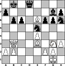 | Partie-Notation im PGN-Format [Event "Winterturnier"] [Site "www.mySchach.de"] [Date "2009.11.12"] [Round "1"] [White "reymund"] [Black "sprinterde"] [ECO "A41"] [WhitemyELO "1624"] [BlackmyELO "1558"] [Result "1/2-1/2"] [TimeControl "10/3456000"] [WhiteDays "156"] [BlackDays "079"] [MySchachNr "60569"] 1. d4 d6 2. e4 e6 3. Nf3 Nf6 4. Nc3 c6 5. Bd3 Nbd7 6. O-O Qa5 7. Bd2 Qh5 8. Ne2 e5 9. Ng3 Qg6 10. h3 Ng8 11. Bc3 f6 12. Nh4 Qf7 13. Nhf5 g6 14. Ne3 exd4 15. Bxd4 Ne5 16. Be2 Qe7 17. c4 Be6 18. Rc1 Bg7 19. c5 Nd7 20. Nc4 Bxc4 21. Bxc4 dxc5 22. Be3 O-O-O 23. Qb3 Nh6 24. Rfd1 Ne5 25. Be6+ Kb8 26. Rxd8+ Rxd8 27. Bxc5 Qc7 28. Rd1 b6 29. Rxd8+ Qxd8 30. Be3 1/2-1/2 Stellungs-Notation im FEN-Format 1k1q4/p5bp/1pp1Bppn/4n3/4P3/1Q2B1NP/PP3PP1/6K1 - - - 1 30 Geschlagene Figuren Weiss:                              Geschlagene Figuren Schwarz:                               Klicken Sie auf eine geschlagene Figur um den gewünschten Zug darzustellen!