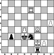 Partie-Notation im PGN-Format [Event "M"] [Site "www.mySchach.de"] [Date "2009.03.12"] [Round "1"] [White "deepsabel"] [Black "BirdofPray1"] [ECO "A46"] [WhitemyELO "1958"] [BlackmyELO "2205"] [Result "0-1"] [TimeControl "10/1728000"] [WhiteDays "20"] [BlackDays "20"] [MySchachNr "53594"] 1. d4 Nf6 2. Nf3 e6 3. c4 h6 4. Nc3 Bb4 5. e3 Bxc3+ 6. bxc3 b6 7. Bd3 Bb7 8. O-O O-O 9. Re1 Be4 10. Bxe4 Nxe4 11. Qc2 f5 12. Nd2 Qh4 13. Nf3 Qf6 14. Ne5 d6 15. Nd3 Nc6 16. f3 Ng5 17. Qa4 Na5 18. c5 Qg6 19. Nf4 Qe8 20. Qxe8 Rfxe8 21. cxd6 cxd6 22. e4 fxe4 23. fxe4 Rac8 24. h4 Nh7 25. e5 dxe5 26. Rxe5 Nf6 27. Rxe6 Rxe6 28. Nxe6 Rc6 29. Nf4 Rxc3 30. Bd2 Ra3 31. Bb4 Ra4 32. Bc3 Kf7 33. Rf1 Rxa2 34. Nh5 Ra3 35. Bb2 Rb3 36. Ba1 Nc4 37. Nxf6 Ne3 38. Rc1 gxf6 39. Rc7+ Ke6 40. Rxa7 b5 41. Kf2 b4 42. Ke2 Kf5 43. Bb2 Nd5 44. Bc1 Ke4 45. Bxh6 Rb2+ 46. Kf1 b3 47. Rb7 f5 48. h5 f4 49. Kg1 Rb1+ 50. Kf2 Ne3 51. Re7+ Kd3 52. Bxf4 Rf1+ 0-1 Stellungs-Notation im FEN-Format 8/4R3/8/7P/3P1B2/1p1kn3/5KP1/5r2 - - - 1 53 Geschlagene Figuren Weiss: Geschlagene Figuren Schwarz: Klicken Sie auf eine geschlagene Figur um den gewünschten Zug darzustellen!
