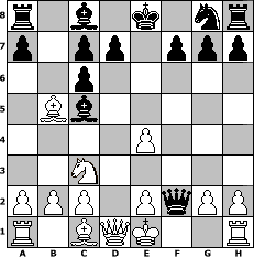 Partie-Notation im PGN-Format [Event "Loyal to the Game II"] [Site "www.mySchach.de"] [Date "2006.01.30"] [Round "1"] [White "FreshPrinc2"] [Black "icke"] [ECO "C21"] [WhitemyELO "889"] [BlackmyELO "1394"] [Result "0-1"] [TimeControl "10/864000"] [WhiteDays "09"] [BlackDays "09"] [MySchachNr "22013"] 1. e4 e5 2. d4 Qf6 3. Nf3 exd4 4. Nxd4 Nc6 5. Nxc6 bxc6 6. Nc3 Bc5 7. Bb5 Qxf2# 0-1 Stellungs-Notation im FEN-Format r1b1k1nr/p1pp1ppp/2p5/1Bb5/4P3/2N5/PPP1PqPP/R1BQK2R - KQkq - 0 8 Geschlagene Figuren Weiss: Geschlagene Figuren Schwarz: Klicken Sie auf eine geschlagene Figur um den gewünschten Zug darzustellen!