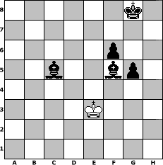 Partie-Notation im PGN-Format [Event "Schach dem "Nikolaus II""] [Site "www.mySchach.de"] [Date "2010.11.13"] [Round "1"] [White "lotchi"] [Black "Greenhorn"] [ECO "C42"] [WhitemyELO "1340"] [BlackmyELO "1600"] [Result "0-1"] [TimeControl "10/2592000"] [WhiteDays "179"] [BlackDays "168"] [MySchachNr "69824"] 1. e4 e5 2. Nf3 Nf6 3. Nc3 Nc6 4. d3 Be7 5. Be3 O-O 6. a3 d5 7. exd5 Nxd5 8. Nxd5 Qxd5 9. c4 Qd7 10. h3 Nd4 11. Nxe5 Qd6 12. f4 Qb6 13. b4 c5 14. Bxd4 cxd4 15. c5 Qe6 16. Be2 f6 17. Nf3 Qd5 18. O-O b6 19. cxb6 axb6 20. Qb1 Bd6 21. g3 Bxh3 22. Rf2 Rfe8 23. Qb2 Bg4 24. a4 Re3 25. Qxd4 Qxd4 26. Nxd4 Rxg3+ 27. Kh2 Rh3+ 28. Kg2 Rh4 29. Kg3 Bxe2 30. Kxh4 Bxd3 31. Rd1 Bc4 32. Rc2 Bf7 33. Rc6 Bxb4 34. Rxb6 Rxa4 35. Rb8+ Bf8 36. Rd8 g6 37. Rc1 h6 38. Rc7 g5+ 39. fxg5 hxg5+ 40. Kg4 Kg7 41. Kf5 Ra5+ 42. Kg4 Kg8 43. Nf5 Ra4+ 44. Kg3 Ra3+ 45. Kf2 Ra2+ 46. Ke3 Ra3+ 47. Ke4 Ra4+ 48. Kd3 Ra3+ 49. Kc2 Bg6 50. Rd5 Rf3 51. Rd8 Bxf5+ 52. Kd2 Rf2+ 53. Ke3 Rc2 54. Rxc2 Bxc2 55. Rc8 Bf5 56. Rc5 Bxc5+ 0-1 Stellungs-Notation im FEN-Format 6k1/8/5p2/2b2bp1/8/4K3/8/8 - - - 0 57 Geschlagene Figuren Weiss: Geschlagene Figuren Schwarz: Klicken Sie auf eine geschlagene Figur um den gewünschten Zug darzustellen!
