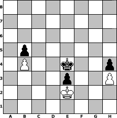 Partie-Notation im PGN-Format [Event "Sommer-ade,scheiden tut weh."] [Site "www.mySchach.de"] [Date "2013.09.18"] [Round "1"] [White "balesbenk1"] [Black "Joschi"] [ECO "B10"] [WhitemyELO "1525"] [BlackmyELO "1598"] [Result "0-1"] [TimeControl "10/1728000"] [WhiteDays "20"] [BlackDays "20"] [MySchachNr "90300"] 1. e4 c6 2. c4 d5 3. cxd5 cxd5 4. exd5 Qxd5 5. Nc3 Qd8 6. Bb5+ Bd7 7. Qb3 Nc6 8. Bxc6 Bxc6 9. f3 Nf6 10. Nge2 e6 11. O-O Bc5+ 12. Kh1 O-O 13. Na4 Be7 14. Nac3 a6 15. d4 Nd5 16. Nxd5 Bxd5 17. Qe3 Bc4 18. Re1 Bf6 19. Rd1 Qb6 20. b3 Bxe2 21. Qxe2 Bxd4 22. Bb2 Bxb2 23. Qxb2 Rad8 24. Rxd8 Rxd8 25. h3 Qe3 26. Qb1 g6 27. Qf1 Rd2 28. Qg1 Qe2 29. Re1 Qf2 30. Qxf2 Rxf2 31. Ra1 e5 32. a3 f5 33. Kh2 Kf7 34. Re1 Ke6 35. Kg3 Rb2 36. b4 Rb3 37. Ra1 g5 38. Kf2 e4 39. fxe4 fxe4 40. Re1 Ke5 41. Re3 Rxe3 42. Kxe3 h5 43. a4 b5 44. axb5 axb5 45. g3 h4 46. gxh4 gxh4 47. Ke2 Kf4 48. Kf2 e3+ 49. Ke2 Ke4 0-1 Stellungs-Notation im FEN-Format 8/8/8/1p6/1P2k2p/4p2P/4K3/8 - - - 2 50 Geschlagene Figuren Weiss: Geschlagene Figuren Schwarz: Klicken Sie auf eine geschlagene Figur um den gewünschten Zug darzustellen!