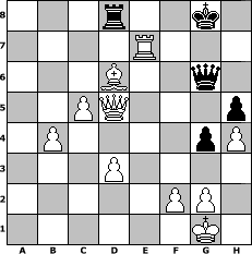 Partie-Notation im PGN-Format [Event "Latvija"] [Site "www.mySchach.de"] [Date "2017.07.03"] [Round "1"] [White "Seneca"] [Black "Knight"] [ECO "C40"] [WhitemyELO "1502"] [BlackmyELO "1219"] [Result "1-0"] [TimeControl "10/2592000"] [WhiteDays "099"] [BlackDays "119"] [MySchachNr "108779"] 1. e4 e5 2. Nf3 f5 3. exf5 Nc6 4. d3 Nf6 5. Be2 Bc5 6. O-O d5 7. Nc3 Bxf5 8. a3 d4 9. Na4 Bb6 10. Nxb6 Bg6 11. Nc4 O-O 12. Ncxe5 Nxe5 13. Nxe5 Qe8 14. Nxg6 Qxg6 15. Bf3 c6 16. Bf4 Nd5 17. Bxd5+ cxd5 18. Bg3 b5 19. Qd2 a5 20. Rae1 b4 21. axb4 axb4 22. Qxb4 Qf7 23. Qxd4 h6 24. h3 Rac8 25. c3 Ra8 26. b4 Qd7 27. Re5 Rf5 28. Rxf5 Qxf5 29. Re1 Rd8 30. c4 g5 31. c5 h5 32. Bd6 g4 33. h4 Qf7 34. Re7 Qg6 35. Qxd5+ 1-0 Stellungs-Notation im FEN-Format 3r2k1/4R3/3B2q1/2PQ3p/1P4pP/3P4/5PP1/6K1 - - - 0 35 Geschlagene Figuren Weiss: Geschlagene Figuren Schwarz: Klicken Sie auf eine geschlagene Figur um den gewünschten Zug darzustellen!