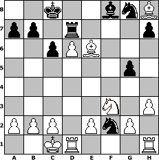 Partie-Notation im PGN-Format [Event "F"] [Site "www.mySchach.de"] [Date "2017.08.16"] [Round "1"] [White "jeremyt"] [Black "augustus"] [ECO "C41"] [WhitemyELO "2142"] [BlackmyELO "1214"] [Result "1-0"] [TimeControl "10/2592000"] [WhiteDays "44"] [BlackDays "40"] [MySchachNr "109218"] 1. e4 e5 2. Nf3 d6 3. d4 Bg4 4. dxe5 c6 5. Bf4 Qa5+ 6. Qd2 Qxd2+ 7. Nbxd2 Nd7 8. exd6 f6 9. h3 Bxf3 10. Nxf3 O-O-O 11. O-O-O g5 12. Bh2 Nc5 13. e5 fxe5 14. Bxe5 Rd7 15. Bxh8 Ne4 16. Bc4 Nxf2 17. Be6 1-0 Stellungs-Notation im FEN-Format 2k2bnB/pp1r3p/2pPB3/6p1/8/5N1P/PPP1PnP1/2KR3R - - - 1 17 Geschlagene Figuren Weiss: Geschlagene Figuren Schwarz: Klicken Sie auf eine geschlagene Figur um den gewünschten Zug darzustellen!