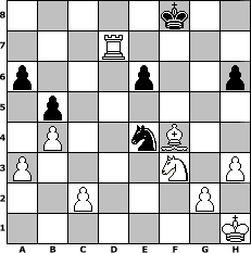 Partie-Notation im PGN-Format [Event "Freibier f"] [Site "www.mySchach.de"] [Date "2006.11.11"] [Round "1"] [White "Sherlock6834"] [Black "crca108"] [ECO "C50"] [WhitemyELO "1600"] [BlackmyELO "1374"] [Result "1-0"] [TimeControl "10/864000"] [WhiteDays "46"] [BlackDays "50"] [MySchachNr "30044"] 1. e4 e5 2. Nf3 Nc6 3. Bc4 h6 4. O-O Nf6 5. d3 Be7 6. Nc3 a6 7. a3 b5 8. Ba2 O-O 9. d4 Bd6 10. b4 Bb7 11. d5 Ne7 12. h3 c6 13. Be3 Rc8 14. dxc6 Rxc6 15. Qd3 Bb8 16. Bc5 Re8 17. Rad1 Ng6 18. Nd5 Nf4 19. Nxf6+ Rxf6 20. Qxd7 Qxd7 21. Rxd7 Bc6 22. Re7 Rxe7 23. Bxe7 Re6 24. Bxe6 fxe6 25. Nd2 Kf7 26. Bc5 Ne2+ 27. Kh1 Kf6 28. Re1 Nc3 29. Re3 Na4 30. Rf3+ Kg5 31. Be7+ Kg6 32. Rf8 Ba7 33. Rc8 Kf7 34. Rxc6 Bxf2 35. Bd8 Be1 36. Nf3 Bg3 37. Rc7+ Ke8 38. Rxg7 Bf4 39. Bc7 Kf8 40. Rd7 Nc3 41. Bxe5 Nxe4 42. Bxf4 1-0 Stellungs-Notation im FEN-Format 5k2/3R4/p3p2p/1p6/1P2nB2/P4N1P/2P3P1/7K - - - 0 42 Geschlagene Figuren Weiss: Geschlagene Figuren Schwarz: Klicken Sie auf eine geschlagene Figur um den gewünschten Zug darzustellen!