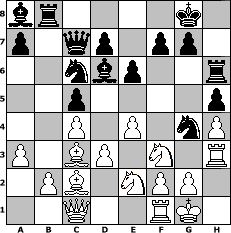 Partie-Notation im PGN-Format [Event "1.MySchach-960-Cup 2015"] [Site "www.mySchach.de"] [Date "2015.10.07"] [Round "1"] [White "Erich"] [Black "nyffhans"] [Variant "Fischerrandom"] [SetUp "1"] [FEN "bbqnnrkr/pppppppp/8/8/8/8/PPPPPPPP/BBQNNRKR w KQkq - 0 1"] [WhitemyELO "2113"] [BlackmyELO "1996"] [Result "1-0"] [TimeControl "10/1728000"] [WhiteDays "20"] [BlackDays "00"] [MySchachNr "100690"] 1. b4 b6 2. c4 c5 3. bxc5 bxc5 4. e4 e6 5. Nf3 h5 6. h4 Rh6 7. Nc3 Nc6 8. Rh3 Nf6 9. d3 Ng4 10. Ne2 Bd6 11. Bc2 Qc7 12. a3 Rb8 13. Bc3 1-0 Stellungs-Notation im FEN-Format br4k1/p1qp1pp1/2nbp2r/2p4p/2P1P1nP/P1BP1N1R/1PB1NPP1/2Q2RK1 - Q - 2 13 Geschlagene Figuren Weiss: Geschlagene Figuren Schwarz: Klicken Sie auf eine geschlagene Figur um den gewünschten Zug darzustellen!