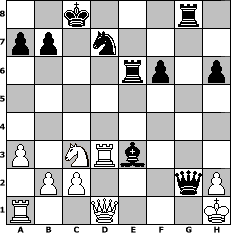 Partie-Notation im PGN-Format [Event "Turnier zum Tag der deutschen Einheit"] [Site "www.mySchach.de"] [Date "2010.10.04"] [Round "1"] [White "Knight"] [Black "wiesel"] [ECO "D00"] [WhitemyELO "1183"] [BlackmyELO "1335"] [Result "0-1"] [TimeControl "10/1728000"] [WhiteDays "60"] [BlackDays "55"] [MySchachNr "68782"] 1. d4 d5 2. e4 dxe4 3. Nc3 Nf6 4. f3 Nc6 5. d5 Ne5 6. fxe4 e6 7. Bg5 h6 8. Bh4 Qd6 9. Bxf6 gxf6 10. Bb5+ Bd7 11. Bxd7+ Nxd7 12. dxe6 fxe6 13. Nf3 O-O-O 14. O-O Qf4 15. Nd4 Qg5 16. Nxe6 Qe3+ 17. Kh1 Re8 18. Nd5 Qxe4 19. Nexc7 Rg8 20. Rf2 Bc5 21. Rd2 Re5 22. Ne6 Rxe6 23. Nc3 Qc6 24. a3 Be3 25. Rd3 Qxg2# 0-1 Stellungs-Notation im FEN-Format 2k3r1/pp1n4/4rp1p/8/8/P1NRb3/1PP3qP/R2Q3K - - - 0 26 Geschlagene Figuren Weiss: Geschlagene Figuren Schwarz: Klicken Sie auf eine geschlagene Figur um den gewünschten Zug darzustellen!