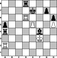 Partie-Notation im PGN-Format [Event "7erD2"] [Site "www.mySchach.de"] [Date "2011.10.14"] [Round "1"] [White "Vahl1"] [Black "sprinterde"] [ECO "A22"] [WhitemyELO "1615"] [BlackmyELO "1678"] [Result "1/2-1/2"] [TimeControl "10/3456000"] [WhiteDays "40"] [BlackDays "40"] [MySchachNr "76771"] 1. c4 e5 2. Nc3 Nf6 3. Nf3 Nc6 4. a3 d5 5. cxd5 Nxd5 6. Qc2 Nxc3 7. bxc3 Bg4 8. d4 Bxf3 9. exf3 Qd5 10. Bd3 exd4 11. Rb1 Qe5+ 12. Qe2 Qxe2+ 13. Kxe2 O-O-O 14. Bf5+ Kb8 15. Be4 d3+ 16. Bxd3 Re8+ 17. Be3 Bxa3 18. Be4 Na5 19. Ra1 Nc4 20. Rhb1 b6 21. Bd5 Nxe3 22. fxe3 Bc5 23. e4 Rd8 24. Bxf7 c6 25. Ra5 Ka8 26. Ra2 Rhf8 27. Bb3 Rde8 28. Rd1 Re7 29. Rad2 a5 30. c4 Rc7 31. Ba4 Kb7 32. h4 Ka6 33. Rb1 Bb4 34. Ra2 Kb7 35. Rd1 Rcf7 36. Bb3 Re7 37. g3 Bc5 38. Bc2 Kc7 39. f4 h6 40. h5 Rf5 41. Rh1 Rf6 42. e5 Re8 43. Rd1 Re7 44. Kd3 Rf5 45. Rh1 Rf8 46. Ke4 Bf2 47. Rf1 Bxg3 48. c5 Rd7 49. cxb6+ Kxb6 50. Ba4 Rfd8 51. Rb1+ Kc7 52. Rc1 Rd4+ 53. Kf3 Bxf4 54. Rxc6+ Kd7 55. Rf6+ Rxa4 56. Rd6+ Ke7 1/2-1/2 Stellungs-Notation im FEN-Format 3r4/4k1p1/3R3p/p3P2P/r4b2/5K2/R7/8 - - - 2 57 Geschlagene Figuren Weiss: Geschlagene Figuren Schwarz: Klicken Sie auf eine geschlagene Figur um den gewünschten Zug darzustellen!