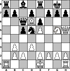 Partie-Notation im PGN-Format [Event "Aljechin zum z\'Nacht...."] [Site "www.mySchach.de"] [Date "2006.09.09"] [Round "1"] [White "bjeu"] [Black "Juliette2103"] [ECO "B02"] [WhitemyELO "2163"] [BlackmyELO "1687"] [Result "1-0"] [TimeControl "10/864000"] [WhiteDays "06"] [BlackDays "02"] [MySchachNr "28291"] 1. e4 Nf6 2. e5 Nd5 3. Bc4 Nb6 4. Bb3 c5 5. d3 Nc6 6. Bf4 e6 7. Nc3 Be7 8. Qh5 Nd4 9. Nf3 Nxb3 10. axb3 O-O 11. Ng5 Bxg5 12. Bxg5 Qc7 13. Be7 Re8 14. Bd6 Qc6 15. Ne4 Nd5 16. Ng5 1-0 Stellungs-Notation im FEN-Format r1b1r1k1/pp1p1ppp/2qBp3/2pnP1NQ/8/1P1P4/1PP1PPPP/R3K2R - KQ - 8 16 Geschlagene Figuren Weiss: ![]() ![]() ![]() ![]() ![]() ![]() ![]() ![]() ![]() ![]() ![]() ![]() ![]() ![]() ![]() Geschlagene Figuren Schwarz: ![]() ![]() ![]() ![]() ![]() ![]() ![]() ![]() ![]() ![]() ![]() ![]() ![]() ![]() ![]() Klicken Sie auf eine geschlagene Figur um den gewünschten Zug darzustellen!