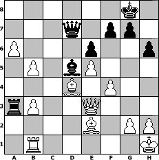 Partie-Notation im PGN-Format [Event "Gegen die Herbstdepression"] [Site "www.mySchach.de"] [Date "2008.12.01"] [Round "2"] [White "rux"] [Black "andreas007"] [ECO "A15"] [WhitemyELO "1378"] [BlackmyELO "1402"] [Result "1-0"] [TimeControl "10/864000"] [WhiteDays "10"] [BlackDays "10"] [MySchachNr "50379"] 1. c4 Nf6 2. Nf3 e6 3. d4 d5 4. Nc3 Be7 5. e3 O-O 6. a3 c5 7. Ne5 Nbd7 8. Be2 cxd4 9. exd4 Nxe5 10. dxe5 Ne4 11. Nxe4 dxe4 12. O-O b6 13. f4 Bc5+ 14. Kh1 Bb7 15. Bd2 Bd4 16. Qc2 Rc8 17. Rfd1 b5 18. Bc3 Qc7 19. Rxd4 e3 20. cxb5 Rfd8 21. Qd3 Rxd4 22. Qxd4 Rd8 23. Qxe3 Bd5 24. Bd4 Qb7 25. Rg1 h6 26. a4 Rc8 27. Bxa7 Rc2 28. Bd4 Qa8 29. b3 Qc8 30. a5 Ra2 31. a6 Ra3 32. Rc1 Qd7 33. Rb1 1-0 Stellungs-Notation im FEN-Format 6k1/3q1pp1/P3p2p/1P1bP3/3B1P2/rP2Q3/4B1PP/1R5K - - - 4 33 Geschlagene Figuren Weiss: ![]() ![]() ![]() ![]() ![]() ![]() ![]() ![]() ![]() ![]() ![]() ![]() ![]() ![]() ![]() Geschlagene Figuren Schwarz: ![]() ![]() ![]() ![]() ![]() ![]() ![]() ![]() ![]() ![]() ![]() ![]() ![]() ![]() ![]() Klicken Sie auf eine geschlagene Figur um den gewünschten Zug darzustellen!