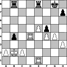 Partie-Notation im PGN-Format [Event ""Gewinne mit Schottisch""] [Site "www.mySchach.de"] [Date "2010.07.11"] [Round "1"] [White "haggard"] [Black "sprinterde"] [ECO "C21"] [WhitemyELO "1503"] [BlackmyELO "1631"] [Result "1-0"] [TimeControl "10/1728000"] [WhiteDays "20"] [BlackDays "20"] [MySchachNr "66890"] 1. e4 e5 2. d4 exd4 3. Nf3 Nc6 4. Bc4 Bc5 5. Ng5 Nh6 6. Nxf7 Nxf7 7. Bxf7+ Kxf7 8. Qh5+ g6 9. Qxc5 d6 10. Qc4+ Be6 11. Qe2 Ne5 12. f4 Bc4 13. Qf2 Nc6 14. Na3 Ba6 15. Kd1 Qd7 16. Bd2 Rae8 17. Re1 d5 18. e5 Qg4+ 19. Kc1 Kg7 20. h3 Qh5 21. b4 b5 22. Qg3 Re6 23. Kb2 Rb8 24. Rad1 Bc8 25. Qb3 a5 26. Qxd5 Nxb4 27. Bxb4 axb4 28. Nxb5 c6 29. Qd8 Rxb5 30. Qc7+ Kf8 31. Qxc8+ Re8 32. Qxc6 Rbb8 33. Qf6+ Kg8 34. Rxd4 Qf5 35. Qxf5 gxf5 36. g4 1-0 Stellungs-Notation im FEN-Format 1r2r1k1/7p/8/4Pp2/1p1R1PP1/7P/PKP5/4R3 - - - 0 36 Geschlagene Figuren Weiss: Geschlagene Figuren Schwarz: Klicken Sie auf eine geschlagene Figur um den gewünschten Zug darzustellen!