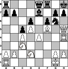 Partie-Notation im PGN-Format [Event "Pedro Damiano"] [Site "www.mySchach.de"] [Date "2016.09.18"] [Round "1"] [White "Naunhofer"] [Black "Knight"] [ECO "C40"] [WhitemyELO "1626"] [BlackmyELO "1137"] [Result "1-0"] [TimeControl "10/2592000"] [WhiteDays "60"] [BlackDays "60"] [MySchachNr "104988"] 1. e4 e5 2. Nf3 f6 3. d4 d6 4. d5 Bg4 5. Be3 c6 6. Be2 Ne7 7. c4 c5 8. O-O Ng6 9. Nc3 Be7 10. Nd2 Nd7 11. Bxg4 O-O 12. f4 exf4 13. Bxf4 Nxf4 14. Rxf4 Ne5 15. Be6+ Kh8 16. Qh5 Ng6 17. Bf5 Qe8 18. Rh4 1-0 Stellungs-Notation im FEN-Format r3qr1k/pp2b1pp/3p1pn1/2pP1B1Q/2P1P2R/2N5/PP1N2PP/R5K1 - - - 8 18 Geschlagene Figuren Weiss: Geschlagene Figuren Schwarz: Klicken Sie auf eine geschlagene Figur um den gewünschten Zug darzustellen!