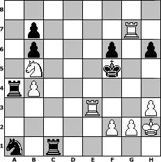 | Partie-Notation im PGN-Format [Event "Winterturnier"] [Site "www.mySchach.de"] [Date "2009.11.12"] [Round "1"] [White "sprinterde"] [Black "RashimIbenRohal"] [ECO "A05"] [WhitemyELO "1558"] [BlackmyELO "1524"] [Result "1-0"] [TimeControl "10/3456000"] [WhiteDays "160"] [BlackDays "159"] [MySchachNr "60578"] 1. Nf3 Nf6 2. c4 e6 3. Nc3 d5 4. cxd5 exd5 5. d4 Bd6 6. Qa4+ c6 7. Bg5 O-O 8. Qb3 Re8 9. e3 Nbd7 10. Bd3 Qb6 11. Qxb6 axb6 12. O-O h6 13. Bxf6 Nxf6 14. h3 Be6 15. Rfc1 Rec8 16. b3 Nd7 17. a4 c5 18. Nb5 Be7 19. e4 f6 20. Nh4 Kf7 21. exd5 Bxd5 22. Nf5 Rc6 23. Bc4 Bxc4 24. Rxc4 cxd4 25. Rxd4 Nc5 26. b4 Nb3 27. Re1 Bf8 28. Rd7+ Kg6 29. Ne7+ Bxe7 30. Rexe7 Rxa4 31. Rxg7+ Kf5 32. Rd3 Rc1+ 33. Kh2 Na1 34. Re3 1-0 Stellungs-Notation im FEN-Format 8/1p4R1/1p3p1p/1N3k2/rP6/4R2P/5PPK/n1r5 - - - 6 34 Geschlagene Figuren Weiss:                              Geschlagene Figuren Schwarz:                               Klicken Sie auf eine geschlagene Figur um den gewünschten Zug darzustellen!