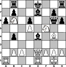 Partie-Notation im PGN-Format [Event "Fr"] [Site "www.mySchach.de"] [Date "2008.02.07"] [Round "2"] [White "schobu2001"] [Black "muellerh"] [ECO "B32"] [WhitemyELO "1545"] [BlackmyELO "1554"] [Result "1-0"] [TimeControl "10/2592000"] [WhiteDays "60"] [BlackDays "30"] [MySchachNr "42421"] 1. e4 c5 2. Nf3 Nc6 3. d4 e6 4. d5 exd5 5. exd5 Nb4 6. Nc3 Nf6 7. Bg5 a6 8. a3 Qe7+ 9. Be2 h6 10. Bxf6 Qxf6 11. O-O d6 12. axb4 cxb4 13. Na4 Rb8 14. Re1 Be7 15. Nb6 Bf5 16. Nd4 Be4 17. Bg4 Qg6 18. Qe2 f5 19. Nxf5 1-0 Stellungs-Notation im FEN-Format 1r2k2r/1p2b1p1/pN1p2qp/3P1N2/1p2b1B1/8/1PP1QPPP/R3R1K1 - k - 0 19 Geschlagene Figuren Weiss: ![]() ![]() ![]() ![]() ![]() ![]() ![]() ![]() ![]() ![]() ![]() ![]() ![]() ![]() ![]() Geschlagene Figuren Schwarz: ![]() ![]() ![]() ![]() ![]() ![]() ![]() ![]() ![]() ![]() ![]() ![]() ![]() ![]() ![]() Klicken Sie auf eine geschlagene Figur um den gewünschten Zug darzustellen!