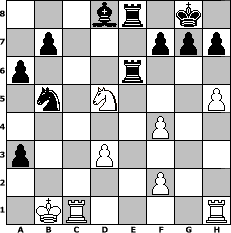 Partie-Notation im PGN-Format [Event "Mal wieder spielen 2"] [Site "www.mySchach.de"] [Date "2013.05.12"] [Round "1"] [White "lotchi"] [Black "reisinger"] [ECO "A02"] [WhitemyELO "1230"] [BlackmyELO "1494"] [Result "0-1"] [TimeControl "10/1728000"] [WhiteDays "22"] [BlackDays "60"] [MySchachNr "88240"] 1. f4 Nc6 2. Nc3 e5 3. fxe5 Nxe5 4. Nf3 Nxf3+ 5. exf3 Nf6 6. Qe2+ Qe7 7. Qxe7+ Bxe7 8. d3 d5 9. Bf4 c5 10. h4 a6 11. Be2 Bf5 12. O-O-O Rc8 13. a3 Nh5 14. g4 Nxf4 15. gxf5 d4 16. Ne4 Nxe2+ 17. Kb1 Rc6 18. c4 dxc3 19. Nxc3 Ng3 20. Rh3 Nxf5 21. h5 O-O 22. Nd5 Bd8 23. b3 Re6 24. Rhh1 Nd4 25. b4 cxb4 26. f4 bxa3 27. Rde1 Rfe8 28. Rc1 Nb5 0-1 Stellungs-Notation im FEN-Format 3br1k1/1p3ppp/p3r3/1n1N3P/5P2/p2P4/5P2/1KR4R - - - 4 29 Geschlagene Figuren Weiss: Geschlagene Figuren Schwarz: Klicken Sie auf eine geschlagene Figur um den gewünschten Zug darzustellen!