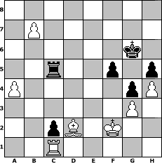 Partie-Notation im PGN-Format [Event "Mal was Anderes."] [Site "www.mySchach.de"] [Date "2013.07.03"] [Round "2"] [White "Knight"] [Black "Wulfen49"] [ECO "C00"] [WhitemyELO "1228"] [BlackmyELO "1267"] [Result "1-0"] [TimeControl "10/2592000"] [WhiteDays "180"] [BlackDays "173"] [MySchachNr "89125"] 1. e4 e6 2. f4 c5 3. d4 d5 4. e5 c4 5. Nc3 Bb4 6. Nge2 Ne7 7. g3 O-O 8. Bg2 Nbc6 9. O-O Nf5 10. Bd2 Nfxd4 11. Nxd4 Nxd4 12. a3 Bc5 13. b4 Bb6 14. h4 Nxc2+ 15. Kh1 Nxa1 16. Qxa1 d4 17. Ne4 a5 18. b5 d3 19. a4 Bd4 20. Qb1 b6 21. Nd6 Bc5 22. Bxa8 Bxd6 23. exd6 Qxd6 24. Be4 f5 25. Bc6 Bd7 26. Bxd7 Qxd7 27. Qa1 Qd5+ 28. Kh2 Qe4 29. Qe1 Qd5 30. Qe3 Qd6 31. Re1 Re8 32. Qe5 Qxe5 33. Rxe5 Kf7 34. Kh3 h5 35. Re1 g6 36. Rg1 Kf6 37. Bc3+ Kf7 38. Bd2 Rc8 39. Rc1 Rc5 40. Kg2 Kf6 41. Kf3 e5 42. fxe5+ Rxe5 43. Bf4 Re4 44. Rd1 Rd4 45. Be3 Rd5 46. Bxb6 c3 47. Bxa5 c2 48. Rc1 g5 49. Bc3+ Kg6 50. b6 d2 51. Bxd2 g4+ 52. Ke2 Re5+ 53. Kf2 Rc5 54. b7 1-0 Stellungs-Notation im FEN-Format 8/1P6/6k1/2r2p1p/P5pP/6P1/2pB1K2/2R5 - - - 0 54 Geschlagene Figuren Weiss: Geschlagene Figuren Schwarz: Klicken Sie auf eine geschlagene Figur um den gewünschten Zug darzustellen!