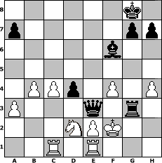 Partie-Notation im PGN-Format [Event "Frauentagsturnier"] [Site "www.mySchach.de"] [Date "2010.03.08"] [Round "1"] [White "Greenhorn"] [Black "pferdemuggelchen"] [ECO "A84"] [WhitemyELO "1579"] [BlackmyELO "1554"] [Result "0-1"] [TimeControl "10/2592000"] [WhiteDays "90"] [BlackDays "89"] [MySchachNr "63811"] 1. d4 f5 2. c4 e6 3. g3 Nf6 4. Bg2 Be7 5. Nf3 O-O 6. O-O d6 7. Nc3 Qe8 8. Bf4 Bd7 9. Qb3 Nc6 10. Qxb7 Rb8 11. Qxc7 Ne4 12. a3 Bd8 13. Qxb8 Nxb8 14. Nxe4 fxe4 15. Nd2 e5 16. dxe5 dxe5 17. Be3 Nc6 18. Bxe4 Nd4 19. Bxd4 exd4 20. b4 Bc6 21. Bxc6 Qxc6 22. Rac1 Qa4 23. Nb1 Re8 24. Rfe1 Qb3 25. Kg2 Bg5 26. f4 Bf6 27. h4 Re3 28. Nd2 Rxg3+ 29. Kf2 Qe3+ 0-1 Stellungs-Notation im FEN-Format 6k1/p5pp/5b2/8/1PPp1P1P/P3q1r1/3NPK2/2R1R3 - - - 2 30 Geschlagene Figuren Weiss: Geschlagene Figuren Schwarz: Klicken Sie auf eine geschlagene Figur um den gewünschten Zug darzustellen!