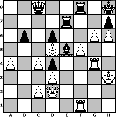 Partie-Notation im PGN-Format [Event "2. Chess960/1"] [Site "www.mySchach.de"] [Date "2008.03.15"] [Round "1"] [White "Stabiloboss"] [Black "BirdofPray1"] [Variant "Fischerrandom"] [SetUp "1"] [FEN "rqnbbknr/pppppppp/8/8/8/8/PPPPPPPP/RQNBBKNR w KQkq - 0 1"] [WhitemyELO "1524"] [BlackmyELO "2240"] [Result "1-0"] [TimeControl "10/3456000"] [WhiteDays "087"] [BlackDays "124"] [MySchachNr "43398"] 1. c4 c5 2. e4 Nh6 3. Nb3 Qc7 4. d3 O-O 5. Bd2 f5 6. Bxh6 gxh6 7. Nf3 e5 8. exf5 Ne7 9. g4 h5 10. h3 a5 11. a4 d6 12. Rg1 Nc6 13. Nbd2 Nb4 14. Ne4 Bc6 15. Be2 h4 16. Qc1 Kg7 17. Neg5 Bd7 18. Nxh4 Be7 19. Nhf3 Rae8 20. Rg3 Qb6 21. Ne4 Qd8 22. Kg1 Rg8 23. Qd2 Ref8 24. Kh2 Kh8 25. b3 Rg7 26. h4 Nc6 27. h5 Rgg8 28. Rag1 Nd4 29. Nxd4 cxd4 30. f4 Bc6 31. Bf3 Bxe4 32. Bxe4 exf4 33. Rf3 Bf6 34. Kh3 b6 35. Bd5 Rg5 36. Rxf4 Be5 37. Rgf1 Qf6 38. Re4 Rg7 39. b4 axb4 40. Qxb4 Ra7 41. Qd2 Rg7 42. Rb1 Qd8 43. Be6 Ra7 44. g5 Re8 45. Rg4 Qa8 46. Rf1 Rf8 47. g6 Re7 48. Bd5 Qc8 49. h6 1-0 Stellungs-Notation im FEN-Format 2q2r1k/4r2p/1p1p2PP/3BbP2/P1Pp2R1/3P3K/2PQ4/5R2 - - - 0 49 Geschlagene Figuren Weiss: Geschlagene Figuren Schwarz: Klicken Sie auf eine geschlagene Figur um den gewünschten Zug darzustellen!