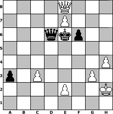 Partie-Notation im PGN-Format [Event "John Owen Turnier 2011"] [Site "www.mySchach.de"] [Date "2011.01.26"] [Round "1"] [White "Lemmi11"] [Black "Svetlana"] [ECO "B00"] [WhitemyELO "1758"] [BlackmyELO "1541"] [Result "1/2-1/2"] [TimeControl "10/2592000"] [WhiteDays "30"] [BlackDays "29"] [MySchachNr "71517"] 1. e4 b6 2. d4 Bb7 3. Nc3 e6 4. Nf3 Bb4 5. Bd3 Bxc3+ 6. bxc3 d6 7. O-O Nd7 8. a4 Ne7 9. a5 O-O 10. Re1 c5 11. Bg5 bxa5 12. h3 f6 13. Bh4 Rb8 14. Qc1 Rc8 15. Qb2 Ba8 16. Bg3 d5 17. Qa3 c4 18. Bf1 dxe4 19. Nd2 Bd5 20. Nxe4 Nf5 21. Bh2 Nb6 22. Qxa5 Rf7 23. Nc5 Qe8 24. Qb4 Re7 25. Ra6 Qg6 26. Qa5 Nh4 27. Re3 Ra8 28. Bd6 Ree8 29. Rg3 Qf7 30. Rg4 g5 31. Bg3 Nf5 32. Bh2 Rec8 33. Re4 Bxe4 34. Nxe4 Rd8 35. Qa2 h5 36. Bxc4 Nxc4 37. Qxc4 Re8 38. Qd3 h4 39. Bd6 Kg7 40. f4 gxf4 41. Bxf4 Rad8 42. Nc5 Kg8 43. Qe4 Qh5 44. Nxe6 Ng7 45. Kh2 Rd7 46. Qc6 Rf7 47. d5 Rfe7 48. Qc4 Nxe6 49. Rxe6 Rxe6 50. dxe6 a5 51. Bd6 a4 52. Qe4 Kg7 53. e7 Qd1 54. Qe6 Qxc2 55. Qg4+ Kf7 56. Qc4+ Kg6 57. Qb5 Kf7 58. Qh5+ Qg6 59. Qxh4 Qd3 60. Qh5+ Ke6 61. Qxe8 Qxd6+ 62. g3 a3 63. h4 1/2-1/2 Stellungs-Notation im FEN-Format 4Q3/4P3/3qkp2/8/7P/p1P3P1/4P2K/8 - - - 0 63 Geschlagene Figuren Weiss: Geschlagene Figuren Schwarz: Klicken Sie auf eine geschlagene Figur um den gewünschten Zug darzustellen!