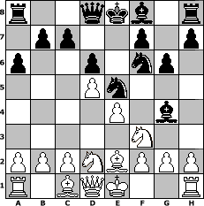 Partie-Notation im PGN-Format [Event "Zug um Zug gegen Fr"] [Site "www.mySchach.de"] [Date "2012.03.12"] [Round "1"] [White "Ziegert"] [Black "Knight"] [ECO "C42"] [WhitemyELO "1533"] [BlackmyELO "1271"] [Result "0-1"] [TimeControl "10/2592000"] [WhiteDays "00"] [BlackDays "30"] [MySchachNr "80563"] 1. e4 e5 2. Nf3 Nf6 3. Nxe5 d6 4. Nf3 Nc6 5. d4 Bg4 6. d5 Ne5 7. Nbd2 a6 8. Be2 g6 0-1 Stellungs-Notation im FEN-Format r2qkb1r/1pp2p1p/p2p1np1/3Pn3/4P1b1/5N2/PPPNBPPP/R1BQK2R - KQkq - 0 9 Geschlagene Figuren Weiss: Geschlagene Figuren Schwarz: Klicken Sie auf eine geschlagene Figur um den gewünschten Zug darzustellen!
