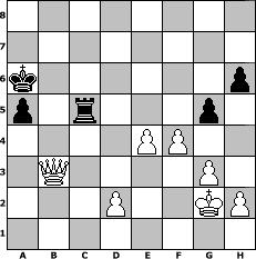 Partie-Notation im PGN-Format [Event "Sommersonne "] [Site "www.mySchach.de"] [Date "2016.05.14"] [Round "1"] [White "espero"] [Black "freizeitspieler"] [ECO "A45"] [WhitemyELO "1816"] [BlackmyELO "1593"] [Result "1-0"] [TimeControl "10/2592000"] [WhiteDays "140"] [BlackDays "148"] [MySchachNr "103625"] 1. d4 Nf6 2. Bg5 g6 3. Bxf6 exf6 4. c4 Bg7 5. Nc3 d6 6. g3 O-O 7. Bg2 c6 8. e3 f5 9. Nge2 Qc7 10. O-O Nd7 11. Qd3 b6 12. b4 Bb7 13. a4 c5 14. Nb5 Qb8 15. Bxb7 Qxb7 16. Nxd6 Qc6 17. bxc5 bxc5 18. Nb5 a6 19. Nbc3 Rfd8 20. Nd5 Kf8 21. Qa3 Ke8 22. Rab1 Rab8 23. a5 Bf8 24. Qc3 g5 25. dxc5 Qxc5 26. Rxb8 Rxb8 27. Rd1 Rc8 28. Qd3 Qxc4 29. Rc1 Qxc1+ 30. Nxc1 Rxc1+ 31. Kg2 Rc6 32. Qxf5 h6 33. Qe4+ Kd8 34. Nb6 Kc7 35. Qe8 Nxb6 36. axb6+ Kxb6 37. Qb8+ Kc5 38. Qxf8+ Kb5 39. Qxf7 a5 40. Qb3+ Ka6 41. e4 Rc5 42. f4 1-0 Stellungs-Notation im FEN-Format 8/8/k6p/p1r3p1/4PP2/1Q4P1/3P2KP/8 - - - 0 42 Geschlagene Figuren Weiss: Geschlagene Figuren Schwarz: Klicken Sie auf eine geschlagene Figur um den gewünschten Zug darzustellen!
