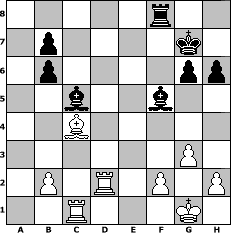 Partie-Notation im PGN-Format [Event "Fr"] [Site "www.mySchach.de"] [Date "2013.03.20"] [Round "1"] [White "Helmut48"] [Black "Teresa"] [ECO "A06"] [WhitemyELO "1966"] [BlackmyELO "1552"] [Result "1-0"] [TimeControl "10/2592000"] [WhiteDays "30"] [BlackDays "30"] [MySchachNr "87288"] 1. Nf3 d5 2. d4 e6 3. c4 c5 4. g3 Nf6 5. cxd5 h6 6. Bg2 Nxd5 7. O-O cxd4 8. Nxd4 Be7 9. e4 Nb6 10. Be3 O-O 11. Qe2 Nc6 12. Rd1 Nxd4 13. Bxd4 Qc7 14. Nc3 e5 15. Bxb6 axb6 16. Nd5 Qd6 17. Rac1 Rxa2 18. Nc3 Qe6 19. Nxa2 Qxa2 20. Bf1 Qe6 21. Qc4 Qxc4 22. Bxc4 g6 23. Rd5 Bc5 24. Rxe5 Kg7 25. Rd5 f5 26. exf5 Bxf5 27. Rd2 1-0 Stellungs-Notation im FEN-Format 5r2/1p4k1/1p4pp/2b2b2/2B5/6P1/1P1R1P1P/2R3K1 - - - 1 27 Geschlagene Figuren Weiss: ![]() ![]() ![]() ![]() ![]() ![]() ![]() ![]() ![]() ![]() ![]() ![]() ![]() ![]() ![]() Geschlagene Figuren Schwarz: ![]() ![]() ![]() ![]() ![]() ![]() ![]() ![]() ![]() ![]() ![]() ![]() ![]() ![]() ![]() Klicken Sie auf eine geschlagene Figur um den gewünschten Zug darzustellen!