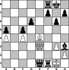 Partie-Notation im PGN-Format [Event "Tunier48"] [Site "www.mySchach.de"] [Date "2011.01.23"] [Round "1"] [White "Andreas54"] [Black "brucybabe"] [ECO "B20"] [WhitemyELO "1474"] [BlackmyELO "1616"] [Result "0-1"] [TimeControl "10/2592000"] [WhiteDays "90"] [BlackDays "88"] [MySchachNr "71448"] 1. e4 c5 2. d3 Nc6 3. Nc3 d6 4. Nf3 g6 5. Be2 Bg7 6. O-O Nf6 7. a4 O-O 8. Nd5 Nxd5 9. exd5 Nb4 10. c4 a5 11. Nd2 e6 12. Bf3 Nxd3 13. dxe6 Bxe6 14. Bxb7 Rb8 15. Be4 Nxc1 16. Qxc1 Bxb2 17. Qc2 Bxa1 18. Rxa1 Qf6 19. g3 Qxa1+ 20. Kg2 Rb2 21. Qd3 Qe1 22. Nf1 Rxf2+ 23. Kg1 Bh3 24. Qe3 Rxf1# 0-1 Stellungs-Notation im FEN-Format 5rk1/5p1p/3p2p1/p1p5/P1P1B3/4Q1Pb/7P/4qrK1 - - - 0 25 Geschlagene Figuren Weiss: Geschlagene Figuren Schwarz: Klicken Sie auf eine geschlagene Figur um den gewünschten Zug darzustellen!