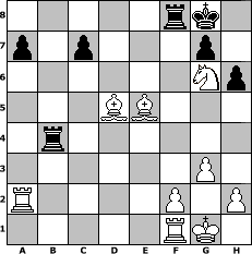 Partie-Notation im PGN-Format [Event "YOUR LAST BREATH"] [Site "www.mySchach.de"] [Date "2019.11.17"] [Round "2"] [White "iamnothere"] [Black "skuehnel"] [ECO "A01"] [WhitemyELO "1432"] [BlackmyELO "1291"] [Result "1-0"] [TimeControl "10/3456000"] [WhiteDays "39"] [BlackDays "38"] [MySchachNr "116349"] 1. b3 e5 2. Bb2 d6 3. g3 Nc6 4. Bg2 Bd7 5. Nf3 f5 6. O-O Nf6 7. d3 Be7 8. Nbd2 O-O 9. c4 h6 10. e4 Nb4 11. Qb1 b5 12. a3 Nc6 13. cxb5 fxe4 14. bxc6 Bxc6 15. dxe4 Rb8 16. b4 d5 17. exd5 Qxd5 18. Nh4 Qxd2 19. Bxc6 Bxb4 20. axb4 Rxb4 21. Qa2+ Kh7 22. Bxe5 Qxa2 23. Rxa2 Ne4 24. Bxe4+ Kh8 25. Ng6+ Kg8 26. Bd5+ 1-0 Stellungs-Notation im FEN-Format 5rk1/p1p3p1/6Np/3BB3/1r6/6P1/R4P1P/5RK1 - - - 4 26 Geschlagene Figuren Weiss: Geschlagene Figuren Schwarz: Klicken Sie auf eine geschlagene Figur um den gewünschten Zug darzustellen!