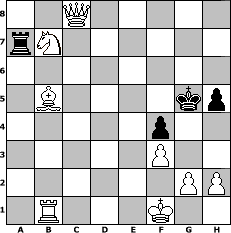 | Partie-Notation im PGN-Format [Event "Winterturnier"] [Site "www.mySchach.de"] [Date "2009.11.12"] [Round "1"] [White "RashimIbenRohal"] [Black "Gauss1233"] [ECO "E70"] [WhitemyELO "1524"] [BlackmyELO "1389"] [Result "1-0"] [TimeControl "10/3456000"] [WhiteDays "194"] [BlackDays "178"] [MySchachNr "60570"] 1. d4 Nf6 2. c4 g6 3. Nc3 Bg7 4. e4 O-O 5. Be2 b6 6. Bg5 Bb7 7. Bxf6 Bxf6 8. Nf3 Bg7 9. O-O d6 10. Re1 e5 11. d5 Nd7 12. b4 Nf6 13. Nd2 c5 14. bxc5 bxc5 15. Rb1 Qd7 16. a4 a6 17. Rb6 Qc7 18. Qb3 Ra7 19. Rb1 Rb8 20. f3 Nd7 21. a5 Qc8 22. Rxd6 Bxd5 23. Qxb8 Nxb8 24. Nxd5 Bf8 25. Rdb6 Ra8 26. Rb7 Nd7 27. Rxd7 Qxd7 28. Nf6+ Kg7 29. Nxd7 Be7 30. Nxe5 f6 31. Nd3 f5 32. exf5 Rd8 33. Nb3 gxf5 34. Ndxc5 Bxc5+ 35. Nxc5 Rd2 36. Kf1 Ra2 37. Nb7 h6 38. c5 Kg6 39. Bxa6 Kg5 40. c6 Rc2 41. Bb5 h5 42. a6 f4 43. a7 Ra2 44. c7 Rxa7 45. c8=Q 1-0 Stellungs-Notation im FEN-Format 2Q5/rN6/8/1B4kp/5p2/5P2/6PP/1R3K2 - - - 0 45 Geschlagene Figuren Weiss:                              Geschlagene Figuren Schwarz:                               Klicken Sie auf eine geschlagene Figur um den gewünschten Zug darzustellen!