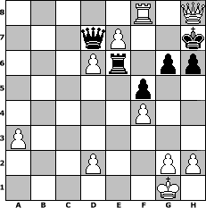 Partie-Notation im PGN-Format [Event "Sp"] [Site "www.mySchach.de"] [Date "2011.09.07"] [Round "1"] [White "reisinger"] [Black "Caligula"] [ECO "D06"] [WhitemyELO "1437"] [BlackmyELO "1361"] [Result "1-0"] [TimeControl "10/1728000"] [WhiteDays "20"] [BlackDays "20"] [MySchachNr "76166"] 1. d4 d5 2. c4 Nf6 3. Nc3 e6 4. Qc2 Nc6 5. e3 Bb4 6. a3 Bxc3+ 7. bxc3 e5 8. dxe5 Nd7 9. cxd5 Ncxe5 10. Be2 Nf6 11. e4 O-O 12. Nf3 Bg4 13. Nxe5 Bxe2 14. Qxe2 Re8 15. f4 Qe7 16. O-O Nd7 17. Nxd7 Qxd7 18. Bb2 Re7 19. c4 f5 20. e5 c6 21. Rad1 Rae8 22. dxc6 Qxc6 23. Rd5 h6 24. Rd1 Kf7 25. Qh5+ Kg8 26. Rd8 Qb6+ 27. Bd4 Qxd8 28. Bc5 Rd7 29. Bd6 Rf8 30. c5 Kh7 31. Rb1 Rff7 32. e6 g6 33. Qf3 Rxd6 34. cxd6 Rf6 35. Rxb7+ Kh8 36. e7 Qe8 37. Qc3 Kg7 38. Qe5 Kf7 39. Rxa7 Re6 40. Qd5 Kf6 41. Ra8 Qd7 42. Rf8+ Kg7 43. Qd4+ Kh7 44. Qh8# 1-0 Stellungs-Notation im FEN-Format 5R1Q/3qP2k/3Pr1pp/5p2/5P2/P7/3P2PP/6K1 - - - 10 44 Geschlagene Figuren Weiss: Geschlagene Figuren Schwarz: Klicken Sie auf eine geschlagene Figur um den gewünschten Zug darzustellen!