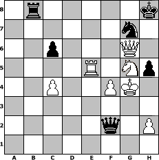 Partie-Notation im PGN-Format [Event "Bauer56-Turnier-1"] [Site "www.mySchach.de"] [Date "2012.02.17"] [Round "1"] [White "Meister64"] [Black "Helmut48"] [ECO "B23"] [WhitemyELO "1776"] [BlackmyELO "1883"] [Result "0-1"] [TimeControl "10/1728000"] [WhiteDays "20"] [BlackDays "20"] [MySchachNr "79955"] 1. e4 c5 2. Nc3 e6 3. f4 a6 4. Nf3 Nc6 5. g3 f6 6. Bg2 Nh6 7. O-O Be7 8. b3 O-O 9. Bb2 d5 10. exd5 exd5 11. Qe2 Re8 12. Rfe1 Bg4 13. Qf1 Nb4 14. Rec1 d4 15. Nd1 Bd7 16. c3 Bb5 17. c4 Bd7 18. a3 Nc6 19. Nf2 Qb6 20. b4 Be6 21. Nd3 Rad8 22. Rab1 cxb4 23. axb4 Bf8 24. Ba1 Kh8 25. Nh4 g6 26. b5 axb5 27. Rxb5 Qa6 28. Nc5 Bxc5 29. Rxc5 Qa2 30. Bxc6 bxc6 31. Qd3 Nf5 32. Nf3 Rd6 33. g4 Ng7 34. Bxd4 Bxg4 35. Qc3 Qa8 36. Bxf6 Rxf6 37. Qxf6 Qa3 38. Re5 Qxc1+ 39. Kf2 Rg8 40. Ng5 Qxd2+ 41. Kg3 h6 42. Kxg4 Qg2+ 43. Kh4 Rb8 44. Qxg6 Qf2+ 45. Kg4 h5+ 0-1 Stellungs-Notation im FEN-Format 1r5k/6n1/2p3Q1/4R1Np/2P2PK1/8/5q1P/8 - - - 0 46 Geschlagene Figuren Weiss: Geschlagene Figuren Schwarz: Klicken Sie auf eine geschlagene Figur um den gewünschten Zug darzustellen!