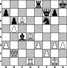 Partie-Notation im PGN-Format [Event "Katalanisch"] [Site "www.mySchach.de"] [Date "2012.06.11"] [Round "1"] [White "Duschgel"] [Black "Tigerle"] [ECO "E00"] [WhitemyELO "1564"] [BlackmyELO "1519"] [Result "1-0"] [TimeControl "10/1728000"] [WhiteDays "19"] [BlackDays "17"] [MySchachNr "82134"] 1. d4 Nf6 2. c4 e6 3. g3 Bb4+ 4. Bd2 Be7 5. Bg2 d5 6. Nf3 O-O 7. O-O c6 8. Nc3 Nbd7 9. cxd5 exd5 10. a3 h6 11. b4 Ne4 12. Nxe4 dxe4 13. Ne1 f5 14. b5 c5 15. Nc2 cxd4 16. Nxd4 Nf6 17. Bf4 Qb6 18. Qb3+ Kh8 19. Rfd1 Rd8 20. Be3 Bc5 21. Qc4 Ne8 22. Nxf5 Rxd1+ 23. Rxd1 Bxf5 24. Bxc5 Qc7 25. Qd5 Bg6 26. Be3 Nf6 27. Qe6 Re8 28. Qb3 Bf7 29. Qb2 b6 30. Bxh6 e3 31. Bxe3 Ng4 32. Bd4 Bc4 33. e3 Qf7 34. h3 Nf6 35. Bc6 1-0 Stellungs-Notation im FEN-Format 4r2k/p4qp1/1pB2n2/1P6/2bB4/P3P1PP/1Q3P2/3R2K1 - - - 2 35 Geschlagene Figuren Weiss: Geschlagene Figuren Schwarz: Klicken Sie auf eine geschlagene Figur um den gewünschten Zug darzustellen!