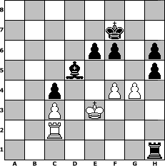 Partie-Notation im PGN-Format [Event "Adventszeit"] [Site "www.mySchach.de"] [Date "2022.11.28"] [Round "1"] [White "Master1"] [Black "Seneca"] [ECO "D00"] [WhitemyELO "1305"] [BlackmyELO "1503"] [Result "0-1"] [TimeControl "10/1728000"] [WhiteDays "20"] [BlackDays "20"] [MySchachNr "128278"] 1. d4 d5 2. e3 e6 3. Bd3 Nf6 4. Nf3 c5 5. c3 Nc6 6. Nbd2 c4 7. Bc2 Be7 8. O-O O-O 9. Re1 a6 10. e4 b5 11. h3 dxe4 12. Nxe4 Nd5 13. a3 Bb7 14. Ng3 a5 15. Be4 Nf6 16. Bg5 Nxe4 17. Bxe7 Qxe7 18. Nxe4 b4 19. axb4 axb4 20. Rxa8 Rxa8 21. Nc5 Bc8 22. cxb4 Nxb4 23. d5 Qxc5 24. d6 Nd3 25. Re2 Qxd6 26. Rd2 Qc7 27. Qb1 Bb7 28. Ne1 Nxe1 29. Qxe1 Qc6 30. f3 h6 31. Rc2 Qb6+ 32. Kh2 Bd5 33. Kg3 Qb3 34. Qc3 Qxc3 35. bxc3 Ra3 36. Kf4 f6 37. g4 Kf7 38. h4 g6 39. Ke3 Ra1 40. f4 Rh1 41. h5 gxh5 0-1 Stellungs-Notation im FEN-Format 8/5k2/4pp1p/3b3p/2p2PP1/2P1K3/2R5/7r - - - 0 42 Geschlagene Figuren Weiss: Geschlagene Figuren Schwarz: Klicken Sie auf eine geschlagene Figur um den gewünschten Zug darzustellen!