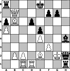 Partie-Notation im PGN-Format [Event "Ja, is denn heut scho Weihnachten?"] [Site "www.mySchach.de"] [Date "2014.12.06"] [Round "1"] [White "Joschi"] [Black "Winston"] [ECO "B28"] [WhitemyELO "1604"] [BlackmyELO "1494"] [Result "0-1"] [TimeControl "10/2592000"] [WhiteDays "90"] [BlackDays "89"] [MySchachNr "97047"] 1. e4 c5 2. Nf3 a6 3. d4 cxd4 4. Nxd4 d6 5. Nc3 e5 6. Nf3 h6 7. Be2 Nf6 8. O-O Be7 9. h3 Be6 10. Be3 Nbd7 11. a4 Nh7 12. a5 Ng5 13. Nxg5 hxg5 14. Qd2 Nf8 15. Bb6 Qc8 16. Qe3 Ng6 17. Rac1 Nf4 18. Rfd1 Bxh3 19. gxh3 Rxh3 20. Qd2 Qe6 21. Nd5 Nxd5 22. Qxd5 Qh6 23. f3 g4 24. Qxb7 Rh1+ 25. Kf2 g3+ 26. Kxg3 Qf4+ 27. Kf2 Bh4+ 28. Kg2 Qh2# 0-1 Stellungs-Notation im FEN-Format r3k3/1Q3pp1/pB1p4/P3p3/4P2b/5P2/1PP1B1Kq/2RR3r - q - 5 29 Geschlagene Figuren Weiss: ![]() ![]() ![]() ![]() ![]() ![]() ![]() ![]() ![]() ![]() ![]() ![]() ![]() ![]() ![]() Geschlagene Figuren Schwarz: ![]() ![]() ![]() ![]() ![]() ![]() ![]() ![]() ![]() ![]() ![]() ![]() ![]() ![]() ![]() Klicken Sie auf eine geschlagene Figur um den gewünschten Zug darzustellen!