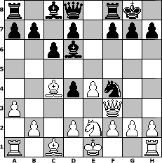 Partie-Notation im PGN-Format [Event "Weihnachts-Turnier 2006"] [Site "www.mySchach.de"] [Date "2006.12.24"] [Round "1"] [White "PublicEnemy"] [Black "korn1991"] [ECO "C25"] [WhitemyELO "1401"] [BlackmyELO "1377"] [Result "0-1"] [TimeControl "10/864000"] [WhiteDays "00"] [BlackDays "14"] [MySchachNr "31072"] 1. e4 e5 2. Nc3 Nc6 3. Bc4 Bc5 4. Qf3 Nf6 5. Nd5 O-O 6. a3 Nd4 7. Qd3 c6 8. c3 Nxd5 9. cxd4 Nf4 10. Qf3 Bd6 11. Ne2 exd4 0-1 Stellungs-Notation im FEN-Format r1bq1rk1/pp1p1ppp/2pb4/8/2BpPn2/P4Q2/1P1PNPPP/R1B1K2R - KQ - 0 12 Geschlagene Figuren Weiss: Geschlagene Figuren Schwarz: Klicken Sie auf eine geschlagene Figur um den gewünschten Zug darzustellen!
