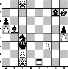 Partie-Notation im PGN-Format [Event "Jagdvariante"] [Site "www.mySchach.de"] [Date "2004.02.23"] [Round "1"] [White "HPB2005"] [Black "VanGott"] [ECO "C70"] [WhitemyELO "1623"] [BlackmyELO "1807"] [Result "1/2-1/2"] [TimeControl "10/2592000"] [WhiteDays "228"] [BlackDays "194"] [MySchachNr "2416"] 1. e4 e5 2. Nf3 Nc6 3. Bb5 a6 4. Ba4 b5 5. Bb3 Na5 6. Bxf7+ Kxf7 7. Nxe5+ Ke7 8. Nf7 Kxf7 9. Qh5+ g6 10. Qd5+ Kg7 11. Qxa8 Nc6 12. d3 Bd6 13. a4 b4 14. Nd2 Nd4 15. Kd1 Nf6 16. f3 c6 17. Qa7 Ne6 18. Nb3 Be5 19. a5 Re8 20. Ra4 Re7 21. Qb6 Qe8 22. d4 Bc7 23. Qxb4 d5 24. e5 Nd7 25. Re1 c5 26. Nxc5 Ndxc5 27. dxc5 Bd8 28. Qa3 Rc7 29. b3 Nxc5 30. Rd4 Be7 31. b4 Ne6 32. Rxd5 Qc6 33. Qa2 Bxb4 34. Bd2 Rb7 35. h4 Be7 36. h5 gxh5 37. Rd3 Nc5 38. Rd4 h4 39. Rf4 Qg6 40. e6 Bxe6 41. Qa1+ Kg8 42. Rb4 Rd7 43. Qc3 Rd8 44. Re2 h5 45. Rd4 Rc8 46. Qe3 Bf6 47. Rd6 Bc4 48. Re1 Na4 49. Qa3 Bb5 50. Qb3+ Kh8 51. Re4 h3 52. Qe6 Rc6 53. gxh3 Rxd6 54. Qxd6 Nb2+ 55. Kc1 Nc4 56. Qb8+ Kh7 57. Qa7+ Kg8 58. Qb8+ Kg7 59. Bb4 Qf7 60. h4 Kh6 61. Qc8 Qd5 62. Qf8+ Kg6 63. Re1 Qd4 64. Qg8+ Bg7 65. Qe6+ Qf6 66. Qe4+ Kh6 67. Bc3 Qxc3 68. Qf4+ Kh7 69. Qf5+ Kg8 70. Qe6+ Kh8 71. Qc8+ Kh7 1/2-1/2 Stellungs-Notation im FEN-Format 2Q5/6bk/p7/Pb5p/2n4P/2q2P2/2P5/2K1R3 - - - 8 72 Geschlagene Figuren Weiss: Geschlagene Figuren Schwarz: Klicken Sie auf eine geschlagene Figur um den gewünschten Zug darzustellen!