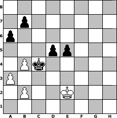 Partie-Notation im PGN-Format [Event "3. Chess960/3"] [Site "www.mySchach.de"] [Date "2009.04.06"] [Round "1"] [White "Heinz@"] [Black "guinan"] [Variant "Fischerrandom"] [SetUp "1"] [FEN "rqknnrbb/pppppppp/8/8/8/8/PPPPPPPP/RQKNNRBB w KQkq - 0 1"] [WhitemyELO "1500"] [BlackmyELO "1511"] [Result "0-1"] [TimeControl "10/3456000"] [WhiteDays "120"] [BlackDays "179"] [MySchachNr "54678"] 1. Ne3 e6 2. f4 g6 3. c3 f5 4. g3 d5 5. Qc2 Nd6 6. O-O-O c6 7. Nd3 Qc7 8. Kb1 c5 9. Bf3 c4 10. Ne5 Bxe5 11. fxe5 N6f7 12. d3 cxd3 13. exd3 Nxe5 14. Bg2 Ndc6 15. d4 Nd7 16. Qc1 O-O-O 17. Nc2 Nf6 18. Be3 Ne4 19. Bf4 Qb6 20. Nb4 Nxb4 21. cxb4+ Kd7 22. Qe3 Rc8 23. a3 Rc6 24. Rc1 Rfc8 25. Be5 Nd6 26. Bxd6 Rxc1+ 27. Rxc1 Rxc1+ 28. Qxc1 Qxd6 29. Bf1 Qb6 30. Qf4 Bf7 31. Qh4 Ke8 32. Qf4 Ke7 33. Bd3 a6 34. Qe3 Be8 35. Qe5 h5 36. Ka2 Qd6 37. Qg7+ Bf7 38. Qh8 Qc7 39. Be2 Qc2 40. Qe5 Qe4 41. h4 Qxe5 42. dxe5 Kf8 43. Kb3 Kg7 44. Kc3 g5 45. Bf1 Be8 46. Kd2 Bb5 47. Bg2 Kg6 48. hxg5 Kxg5 49. Ke3 Kg4 50. Kf2 f4 51. Bf3+ Kg5 52. gxf4+ Kxf4 53. Bxh5 Kxe5 54. Be2 Bxe2 55. Kxe2 Kd4 56. Kd2 e5 57. Ke2 Kc4 0-1 Stellungs-Notation im FEN-Format 8/1p6/p7/3pp3/1Pk5/P7/1P2K3/8 - - - 2 58 Geschlagene Figuren Weiss: ![]() ![]() ![]() ![]() ![]() ![]() ![]() ![]() ![]() ![]() ![]() ![]() ![]() ![]() ![]() Geschlagene Figuren Schwarz: ![]() ![]() ![]() ![]() ![]() ![]() ![]() ![]() ![]() ![]() ![]() ![]() ![]() ![]() ![]() Klicken Sie auf eine geschlagene Figur um den gewünschten Zug darzustellen!