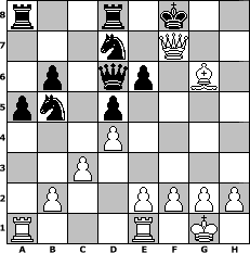 Partie-Notation im PGN-Format [Event "Winterturnier 2016"] [Site "www.mySchach.de"] [Date "2016.12.01"] [Round "1"] [White "jeremyt"] [Black "Joschi"] [ECO "B13"] [WhitemyELO "2072"] [BlackmyELO "1625"] [Result "1-0"] [TimeControl "10/3456000"] [WhiteDays "40"] [BlackDays "40"] [MySchachNr "105913"] 1. e4 c6 2. d4 d5 3. exd5 cxd5 4. Bd3 Nc6 5. c3 Nf6 6. Bf4 e6 7. Nf3 Bd6 8. Bxd6 Qxd6 9. O-O O-O 10. Re1 a5 11. a4 b6 12. Na3 Ba6 13. Nb5 Bxb5 14. axb5 Na7 15. Ne5 Nd7 16. Qh5 g6 17. Qh6 Rfd8 18. Nxf7 Kxf7 19. Qxh7+ Kf8 20. Bxg6 Nxb5 21. Qf7# 1-0 Stellungs-Notation im FEN-Format r2r1k2/3n1Q2/1p1qp1B1/pn1p4/3P4/2P5/1P2PPPP/R3R1K1 - - - 1 21 Geschlagene Figuren Weiss: Geschlagene Figuren Schwarz: Klicken Sie auf eine geschlagene Figur um den gewünschten Zug darzustellen!