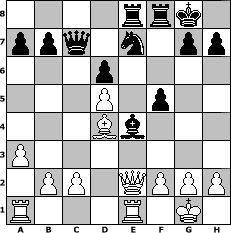 Partie-Notation im PGN-Format [Event "Sweschnikow III"] [Site "www.mySchach.de"] [Date "2012.09.05"] [Round "2"] [White "Steffi"] [Black "sprinterde"] [ECO "B33"] [WhitemyELO "1618"] [BlackmyELO "1707"] [Result "0-1"] [TimeControl "10/1728000"] [WhiteDays "20"] [BlackDays "18"] [MySchachNr "83780"] 1. e4 c5 2. Nf3 Nc6 3. d4 cxd4 4. Nxd4 Nf6 5. Nc3 e5 6. Ndb5 Bb4 7. a3 Bxc3+ 8. Nxc3 Qa5 9. Bd2 Qb6 10. Nd5 Nxd5 11. exd5 Ne7 12. Bc3 d6 13. Be2 O-O 14. O-O Bf5 15. Bd3 e4 16. Bxe4 Bxe4 17. Re1 f5 18. Bd4 Qc7 19. Qe2 Rae8 0-1 Stellungs-Notation im FEN-Format 4rrk1/ppq1n1pp/3p4/3P1p2/3Bb3/P7/1PP1QPPP/R3R1K1 - - - 4 20 Geschlagene Figuren Weiss: Geschlagene Figuren Schwarz: Klicken Sie auf eine geschlagene Figur um den gewünschten Zug darzustellen!