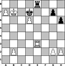 Partie-Notation im PGN-Format [Event "Mal wieder spielen 2"] [Site "www.mySchach.de"] [Date "2013.05.12"] [Round "1"] [White "Steffi"] [Black "reisinger"] [ECO "D06"] [WhitemyELO "1534"] [BlackmyELO "1494"] [Result "1-0"] [TimeControl "10/1728000"] [WhiteDays "061"] [BlackDays "100"] [MySchachNr "88266"] 1. d4 d5 2. c4 Nf6 3. Nc3 Bf5 4. Nf3 h6 5. Qa4+ c6 6. cxd5 Nxd5 7. Qb3 Qc7 8. Nxd5 cxd5 9. Qxd5 e6 10. Qb5+ Nc6 11. Bd2 a6 12. Qb3 Be7 13. e3 Na5 14. Bxa5 Qxa5+ 15. Nd2 Bb4 16. Qd1 O-O 17. a3 Bxd2+ 18. Qxd2 Qxd2+ 19. Kxd2 Rfc8 20. Bd3 Bxd3 21. Kxd3 Rc6 22. Rac1 Rac8 23. Rc3 b5 24. Rhc1 Rxc3+ 25. Rxc3 Rd8 26. Rc7 Rd6 27. e4 e5 28. d5 f6 29. Rc6 Rd7 30. Rxa6 Rb7 31. d6 Kf7 32. Kc3 Ke6 33. Kb4 f5 34. exf5+ Kxf5 35. Kc5 Ke6 36. Rb6 Rd7 37. Kxb5 e4 38. a4 Rf7 39. a5 Rxf2 40. Kc6 Rc2+ 41. Kb7 e3 42. a6 Kd7 43. a7 Rc8 44. Rb3 Re8 45. Rxe3 1-0 Stellungs-Notation im FEN-Format 4r3/PK1k2p1/3P3p/8/8/4R3/1P4PP/8 - - - 0 45 Geschlagene Figuren Weiss: Geschlagene Figuren Schwarz: Klicken Sie auf eine geschlagene Figur um den gewünschten Zug darzustellen!