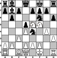 Partie-Notation im PGN-Format [Event "960 zum 1."] [Site "www.mySchach.de"] [Date "2015.11.05"] [Round "1"] [White "Schachfedi"] [Black "Winston"] [Variant "Fischerrandom"] [SetUp "1"] [FEN "rbbqnknr/pppppppp/8/8/8/8/PPPPPPPP/RBBQNKNR w KQkq - 0 1"] [WhitemyELO "1828"] [BlackmyELO "1458"] [Result "1-0"] [TimeControl "10/2592000"] [WhiteDays "47"] [BlackDays "00"] [MySchachNr "101139"] 1. d4 d5 2. Nd3 h6 3. c3 Ngf6 4. Nf3 Nd6 5. h3 b6 6. Nde5 Bb7 7. Bf5 Nxf5 8. g4 Nd6 9. Nh4 Nde4 10. Nf5 1-0 Stellungs-Notation im FEN-Format rb1q1k1r/pbp1ppp1/1p3n1p/3pNN2/3Pn1P1/2P4P/PP1PPP2/R1BQ1K1R - KQkq - 4 10 Geschlagene Figuren Weiss: Geschlagene Figuren Schwarz: Klicken Sie auf eine geschlagene Figur um den gewünschten Zug darzustellen!